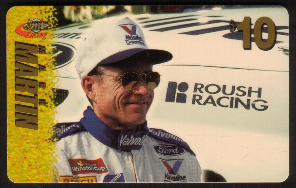 This collectible phone card features a close-up photographic image of NASCAR driver Mark Martin. He is wearing a white racing suit adorned with prominent logos including Valvoline, Ford, and the NASCAR Winston Cup. Mark Martin is also wearing reflective sunglasses and a white Valvoline-branded cap. The card displays the text "MARTIN" vertically in gold lettering on the left side, accompanied by the "Assets Racing" logo in the top-left corner.