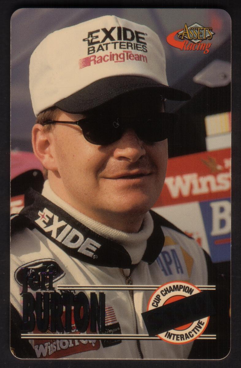 Overall, the card celebrates Jeff Burton’s involvement in NASCAR during the mid-1990s, combining his image with corporate sponsors and racing-related branding, making it a valuable item for enthusiasts of auto racing collectibles.