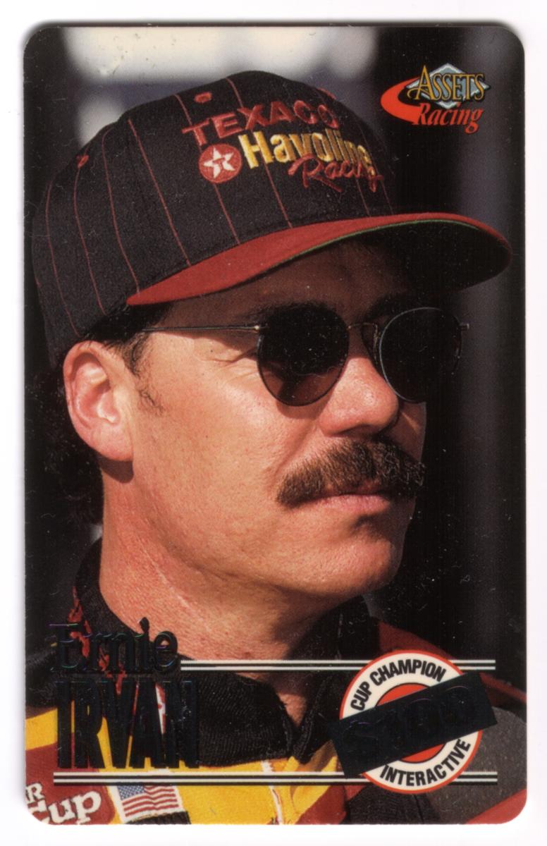 Additional branding includes the "Assets Racing" logo in the top right corner in gold and red. The card references corporate trademarks such as Texaco Havoline, linking it to auto racing sponsorships. The overall design presents Ernie Irvan as a notable figure within NASCAR racing during the mid-1990s, making this card a significant piece for collectors focused on motorsports memorabilia.