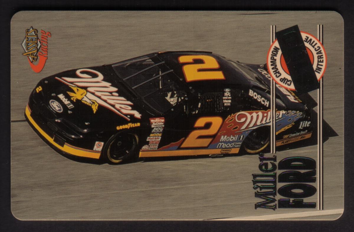 This collectible phone card from 1996 features an image connected to NASCAR auto racing, highlighting Rusty Wallace, a prominent driver associated with the #2 Miller Ford. The card includes the Miller Beer logo prominently displayed, linking it to its corporate sponsorship. The overall design incorporates elements related to racing, such as cars and automotive branding, reflecting the competitive spirit and commercial partnerships within NASCAR.