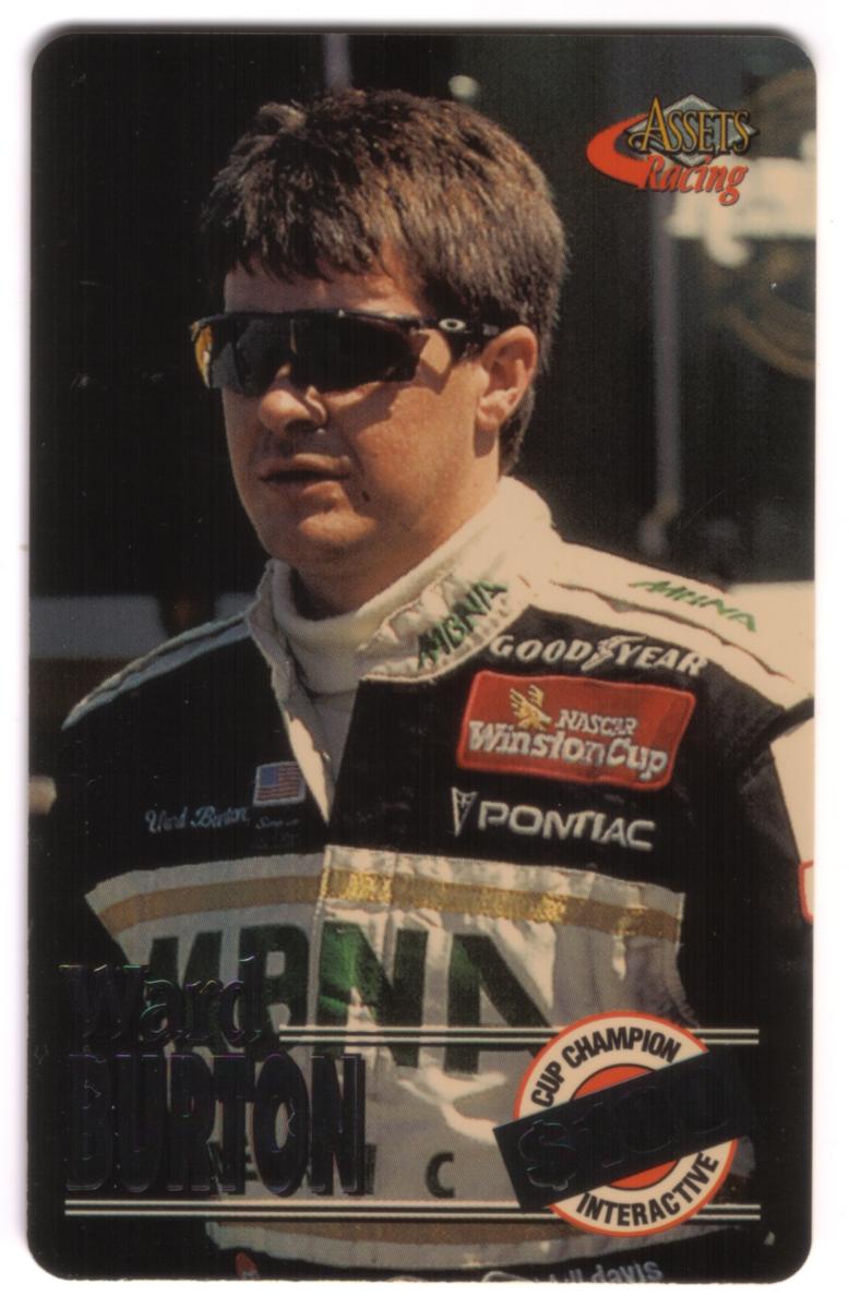 This collectible card features Ward Burton, a professional NASCAR driver, prominently displayed on the left side of the card. He is wearing a racing suit with sponsor logos and holding a racing helmet, standing in front of a racing environment. The card highlights his association with Champion Assets Racing in 1996, emphasizing his participation in the NASCAR Cup Series as a cup champion.