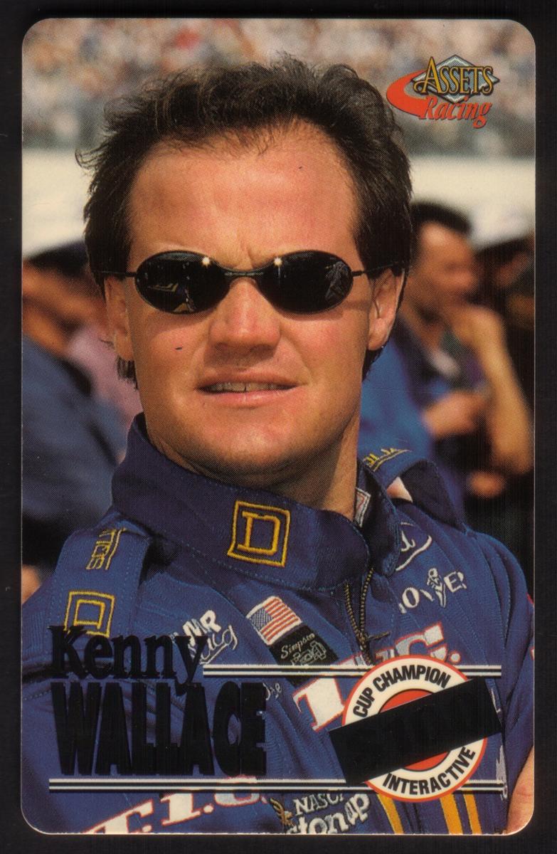 The card showcases imagery related to NASCAR and automobiles, reflecting the theme of NASCAR racing with a focus on Kenny Wallace’s participation in the 1996 season. The card’s value is marked as $100 with a $5 designation, indicating its collectible nature and limited edition status. The background and details highlight the automotive racing theme, specifically tied to the Champion Assets Racing collection.