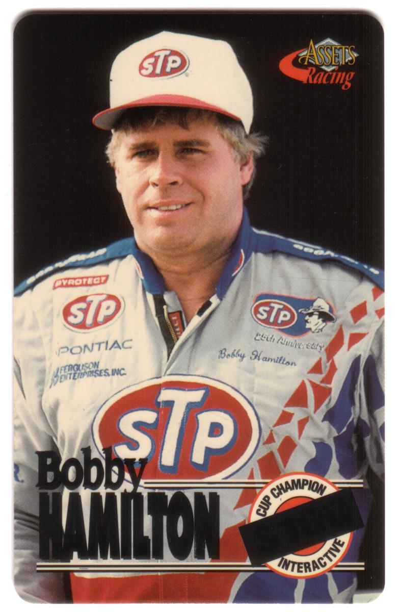 This collectible card features Bobby Hamilton, a prominent NASCAR driver, in his racing suit standing next to his Pontiac race car. The card displays several automotive-related logos, including STP, a well-known motor oil and additive brand prominently featured on the hood and sides of the car. The front of the car also displays the Pontiac logo, indicating the make of the vehicle. Bobby Hamilton is wearing his racing suit adorned with STP branding and other sponsor logos. The image portrays him confidently posed with a focused expression.