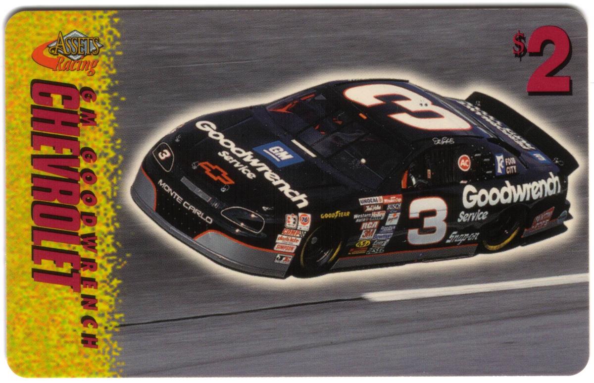 Overall, this phone card celebrates NASCAR racing and the 1996 season, emphasizing the GM Goodwrench Chevrolet race car’s presence and sponsorship within the sport. It combines vibrant automotive imagery with clear racing references and corporate branding, making it a collectible item for fans of auto racing and NASCAR memorabilia.