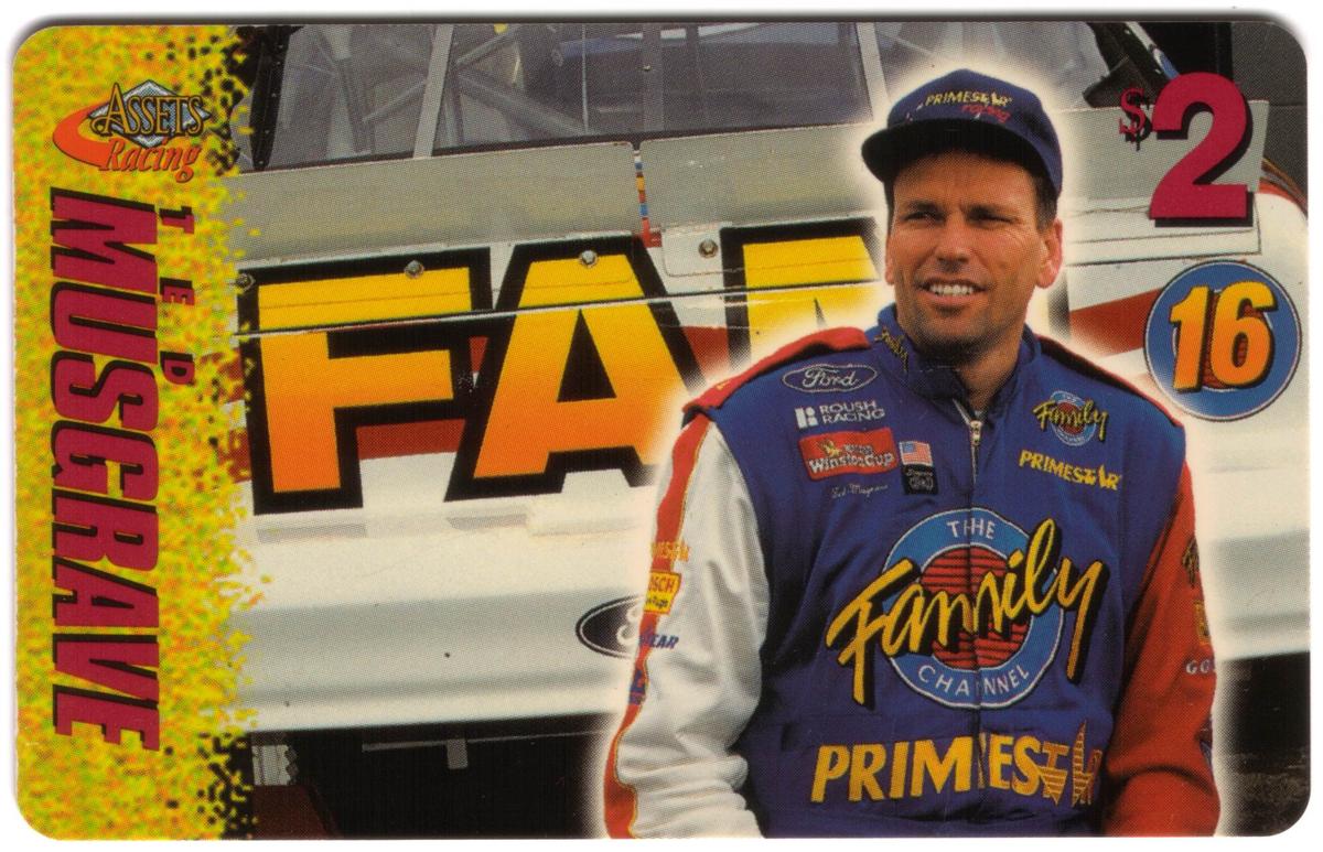 Overall, the card is a detailed collectible representing Ted Musgrave’s 1996 racing season under Assets Racing, with authentic brand logos and official racing imagery, clearly positioning it within motorsports memorabilia.