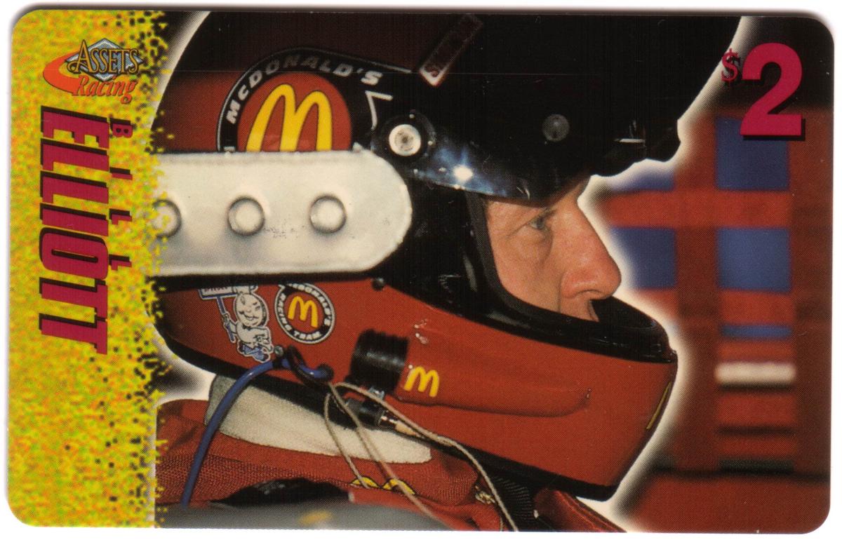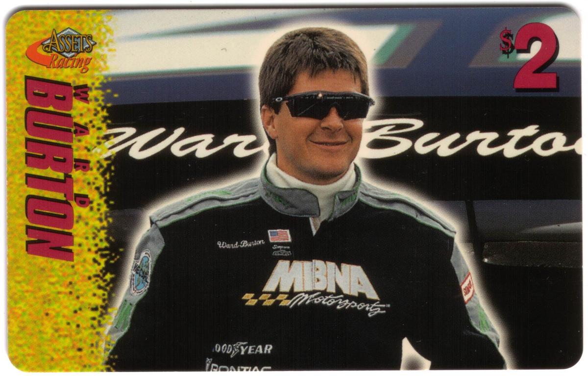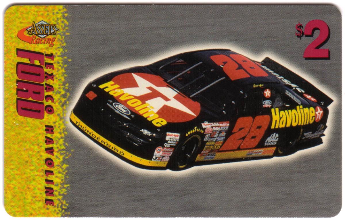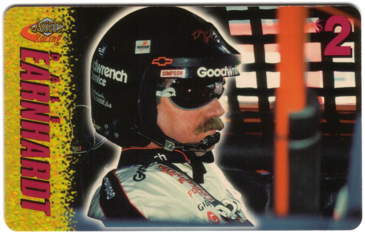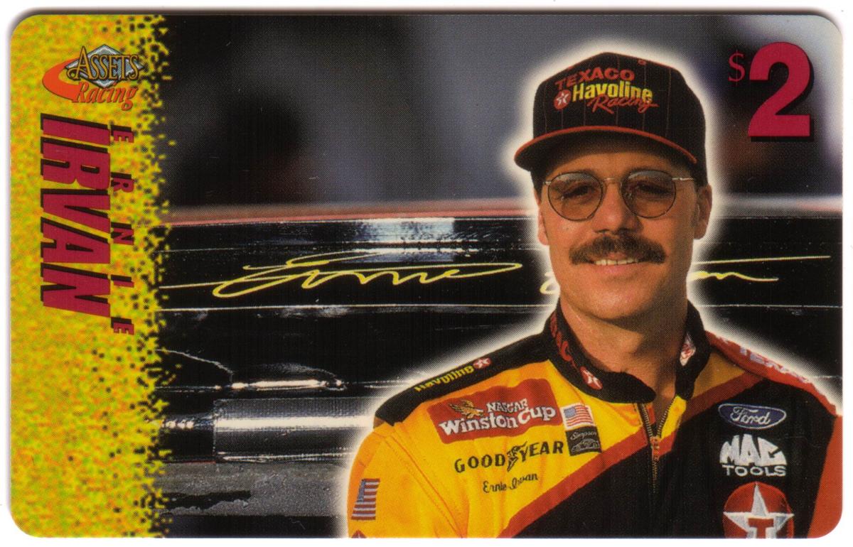 This collection of collectible phone cards from The Score Board Inc. features a complete set of 25 different cards from the 1996 Assets Racing series. Each card is denominated at $2 and highlights NASCAR auto racing themes focused on drivers, their cars, and racing sponsors. The left side of each card presents the "Assets Racing" logo in red and yellow against a textured yellow background, with the driver's last name printed vertically in large, bold letters matching the theme color.