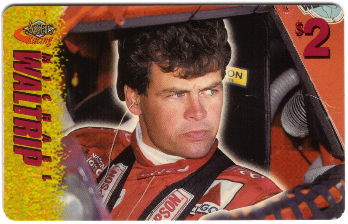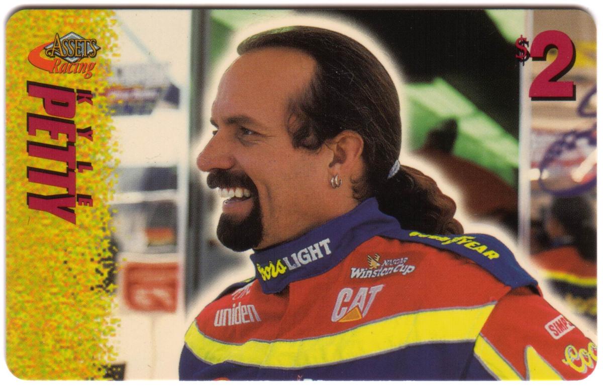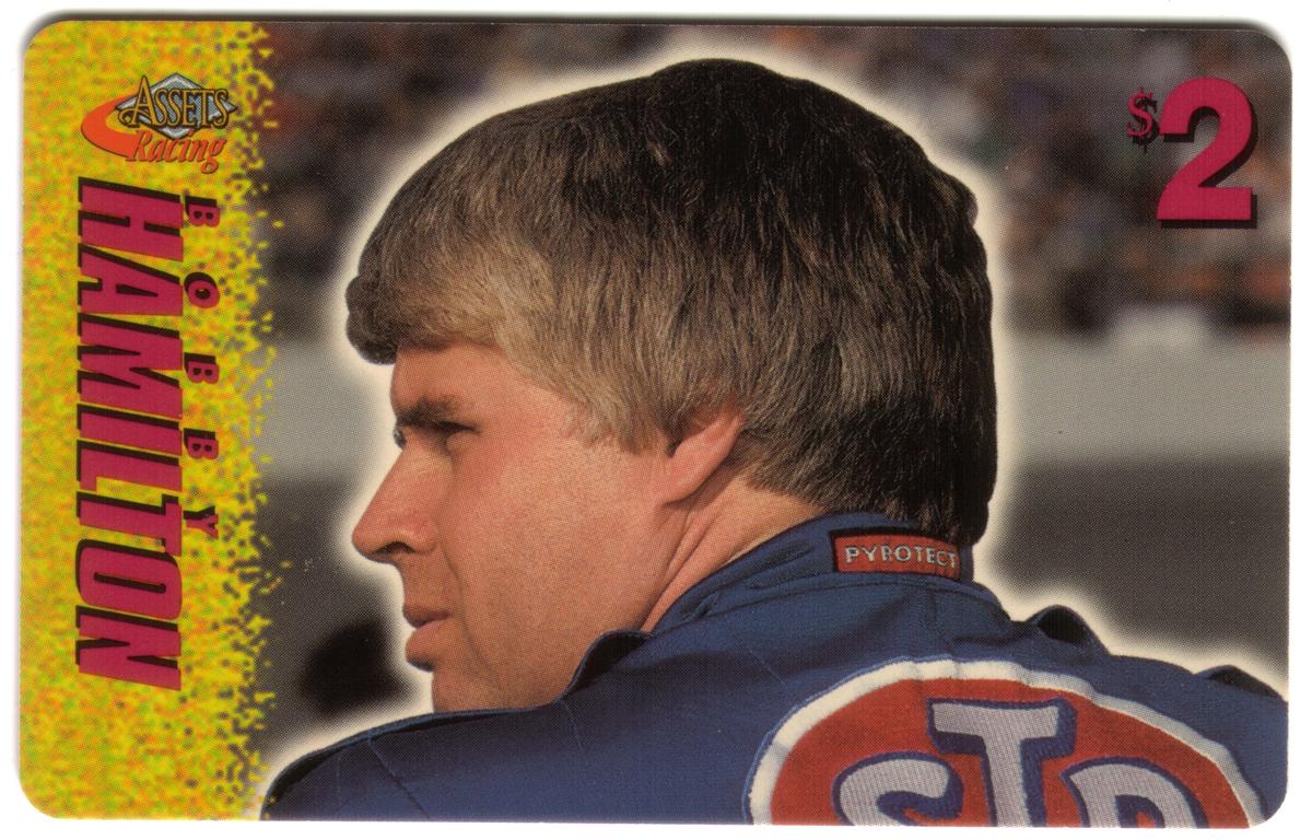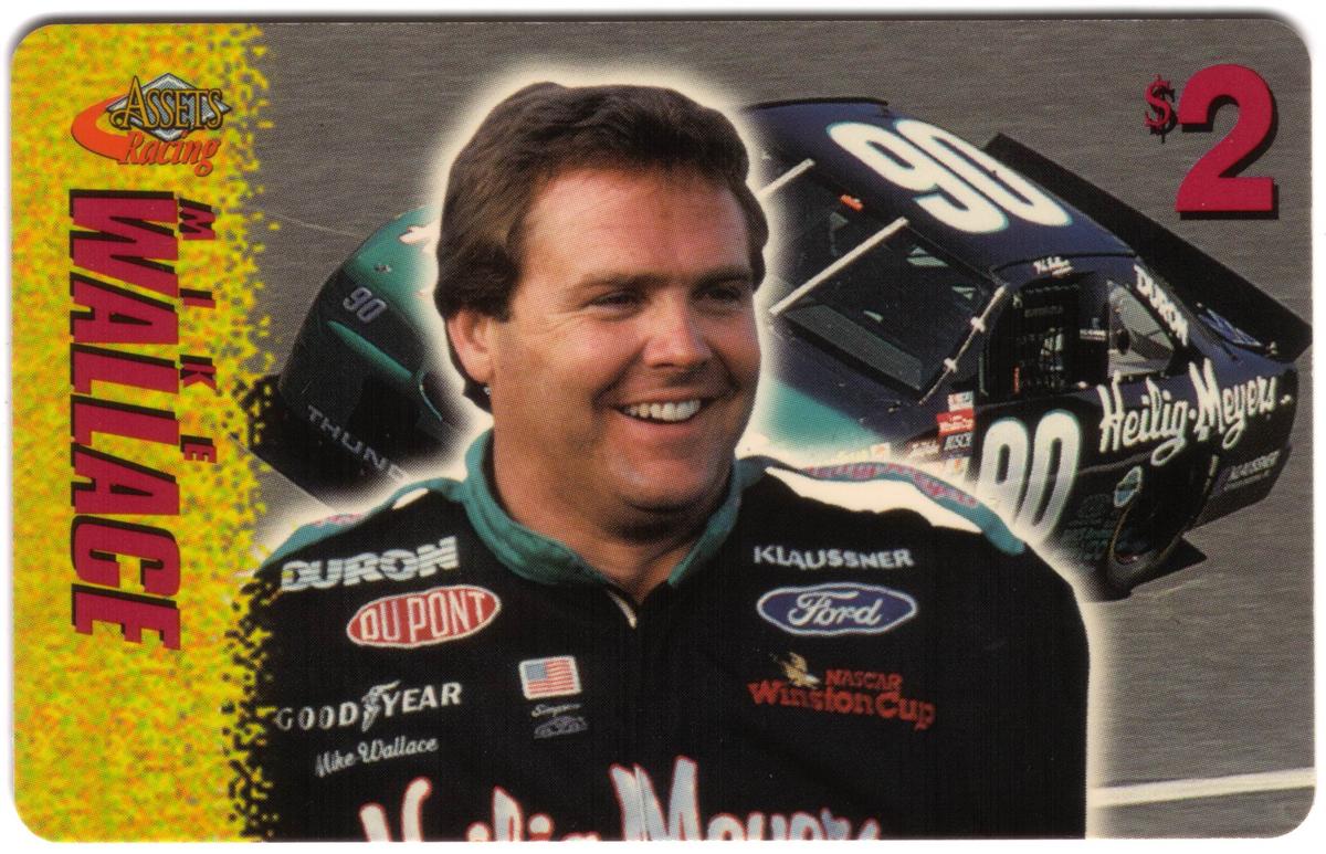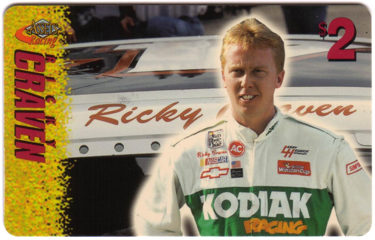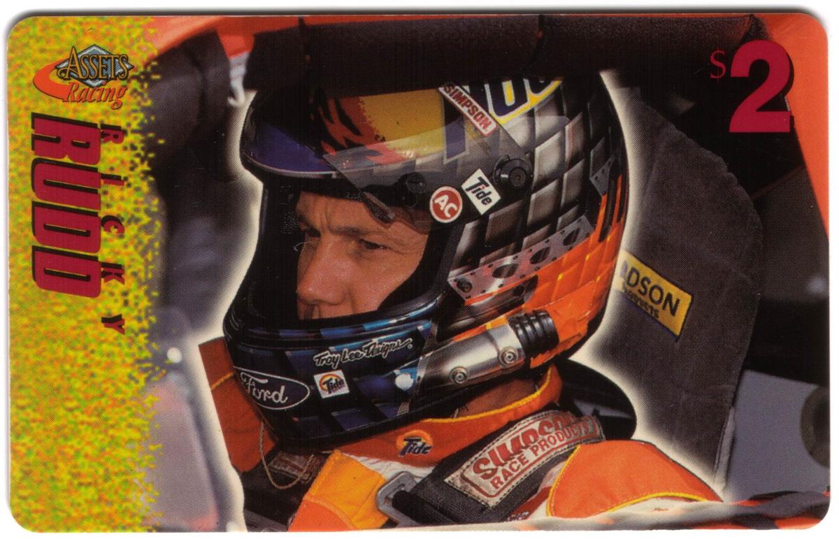 This collection of collectible phone cards from The Score Board Inc. features a complete set of 25 different cards from the 1996 Assets Racing series. Each card is denominated at $2 and highlights NASCAR auto racing themes focused on drivers, their cars, and racing sponsors. The left side of each card presents the "Assets Racing" logo in red and yellow against a textured yellow background, with the driver's last name printed vertically in large, bold letters matching the theme color.