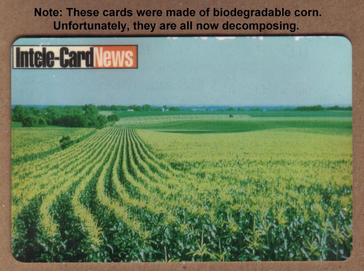 The top of the card includes text in black and orange that reads "Intele-Card News" on a white background strip. Above this, printed in black, is a clear notice stating that the cards were made from biodegradable corn material and that all of the cards are now decomposing.