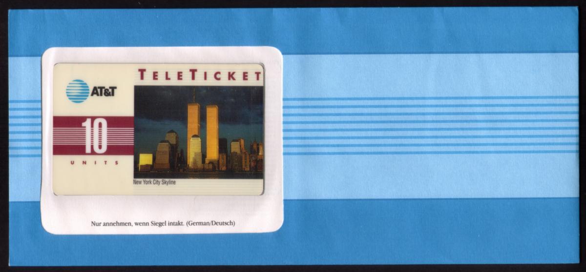 This collectible phone card is an AT&T Teleticket with a value of 10 units. It features a striking photographic image of the New York City skyline, prominently showcasing the World Trade Center Twin Towers illuminated against a dark sky. The Golden light casts a warm glow on the buildings highlighting the architectural elements of the iconic towers and surrounding skyscrapers.