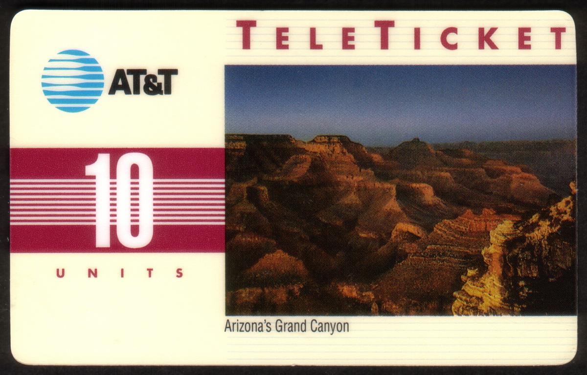 This collectible AT&T Teleticket phone card showcases a scenic image of Arizona’s Grand Canyon, a renowned natural landmark and national park. The front of the card features a vivid photographic view of the Grand Canyon’s rugged mountain terrain, highlighting its layered geological formations. The colors present include various earth tones such as rust reds, browns, and muted greens under a clear blue sky. Tree branches frame parts of the landscape, adding depth to the natural scenery.