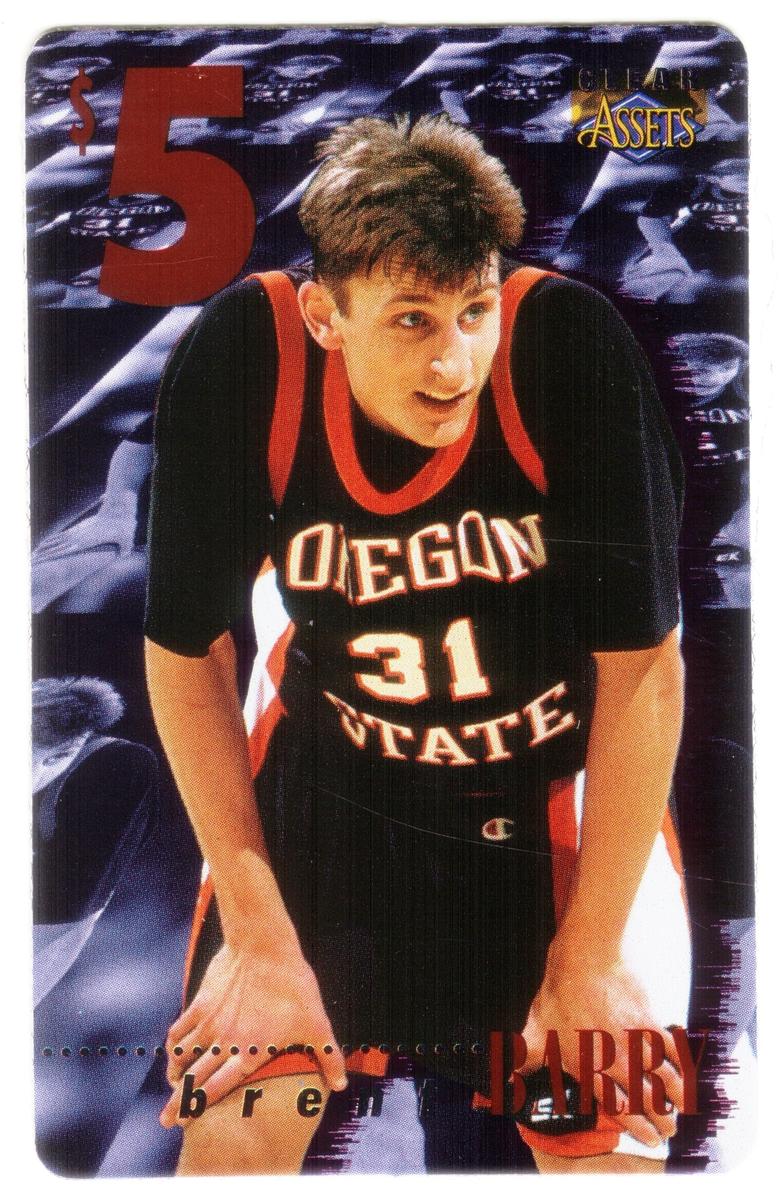 This collectible card features Brent Barry, a basketball player wearing a black Oregon State jersey with the number 31. The jersey has bold orange and white accents with "OREGON STATE" prominently displayed across the chest. Brent Barry is pictured leaning forward with both hands resting on his knees, looking to his left.