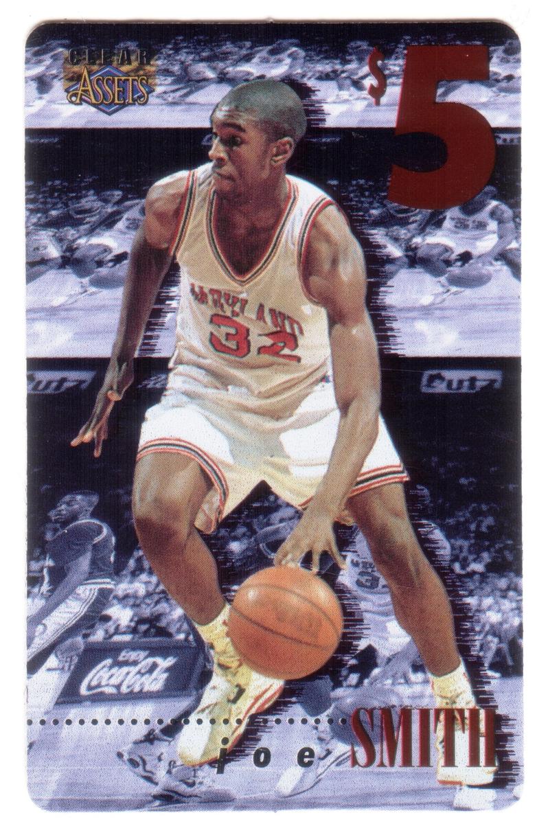 The card has a $5 denomination prominently displayed in the upper right corner in red, and the text "Clear Assets" is visible near the top left corner. At the bottom right, "Joe SMITH" is printed with "Joe" in black lowercase letters and "SMITH" in larger red uppercase letters. The card is from 1996 and issued by The Score Board Inc. as part of the Clear Assets series (#11 of 20). It highlights Joe Smith's basketball career during his National Basketball Association tenure.