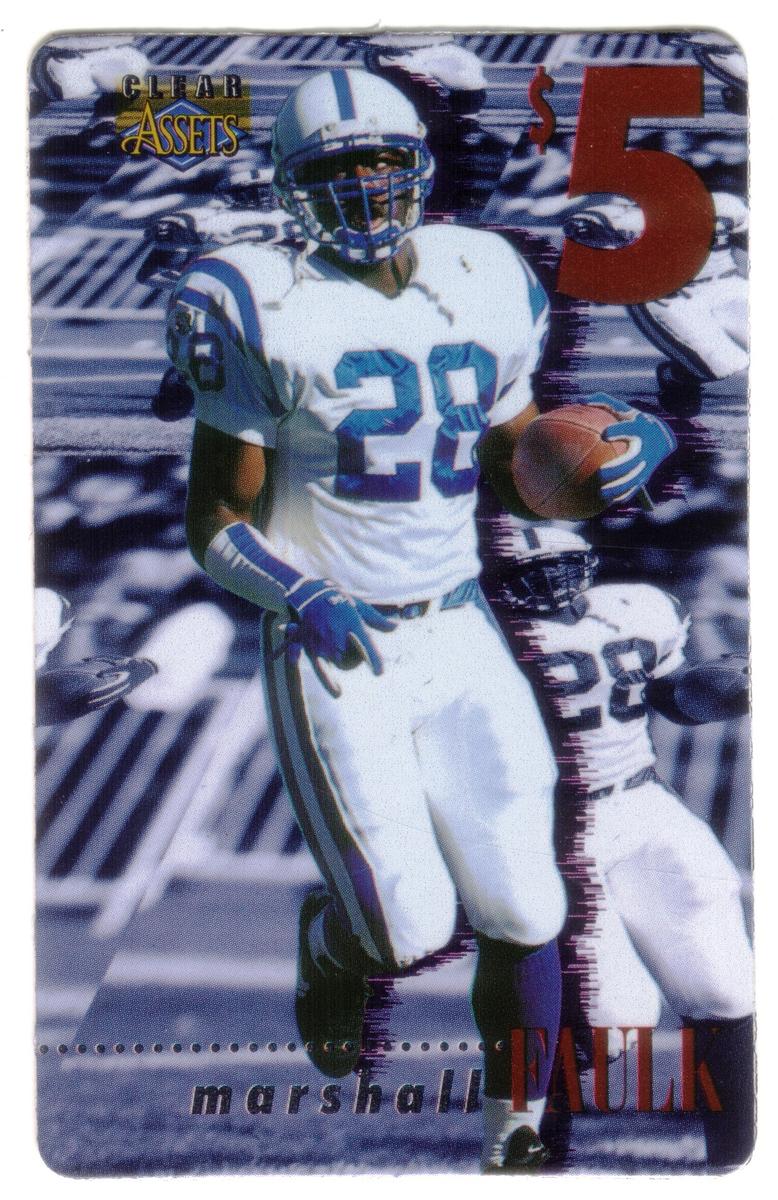 This collectible phone card features NFL player Marshall Faulk in full football uniform with the jersey number 28, running with a football tucked under his right arm. The card displays the text "CLEAR ASSETS" in gold lettering at the top left corner and a large red "$5" at the top right, indicating the card's value. The name "marshall FAULK" is printed near the bottom in lowercase and uppercase letters, with "FAULK" highlighted in red.