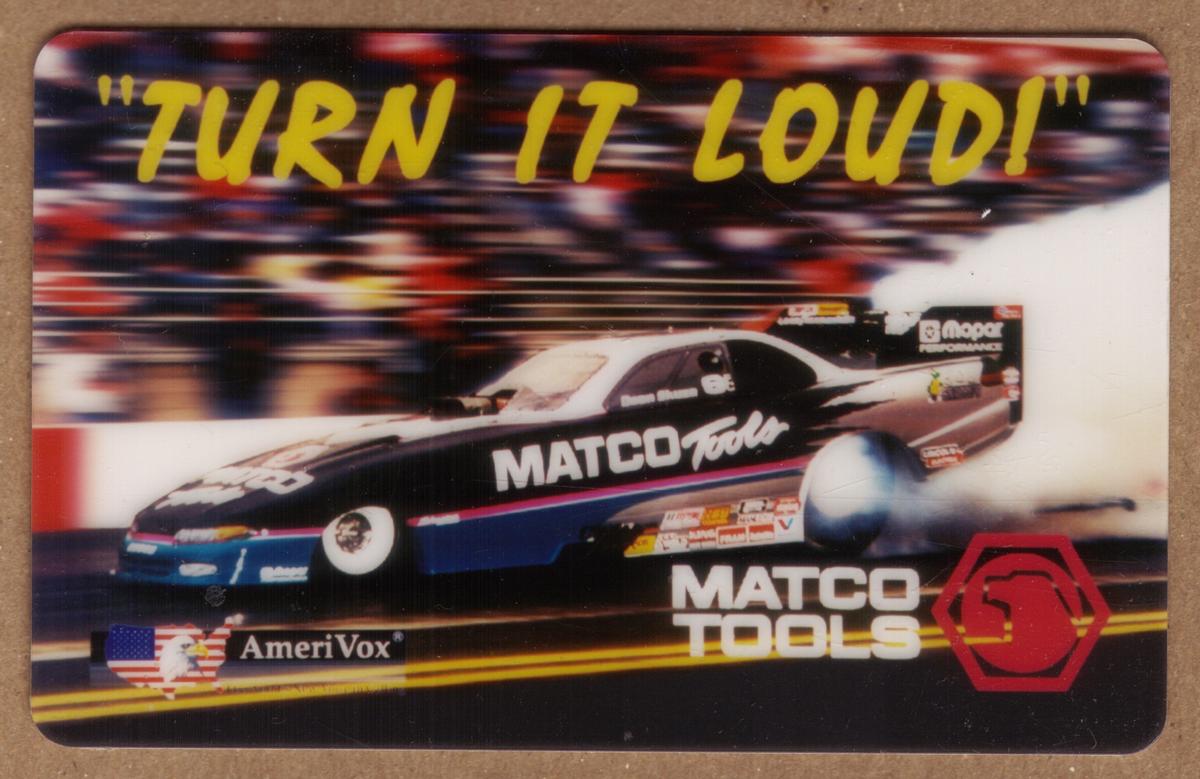 This collectible phone card features a dynamic photo of a MATCO Tools drag racing car in action. The car is predominantly black with white and red accents, prominently displaying the "MATCO Tools" logo on the side. The vehicle is captured speeding on a race track, with blurred crowd stands in the background emphasizing its high velocity. Smoke is visible near the rear tires, indicating rapid acceleration.