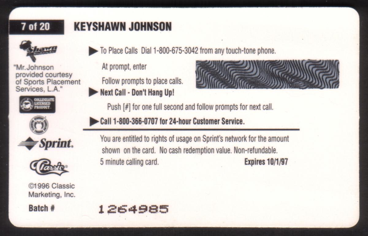 This card is part of the 1996 Clear Assets series related to the National Football League (NFL) and features Keyshawn Johnson, a well-known football player. The specific designation of this card is #7 of 20 in the series.