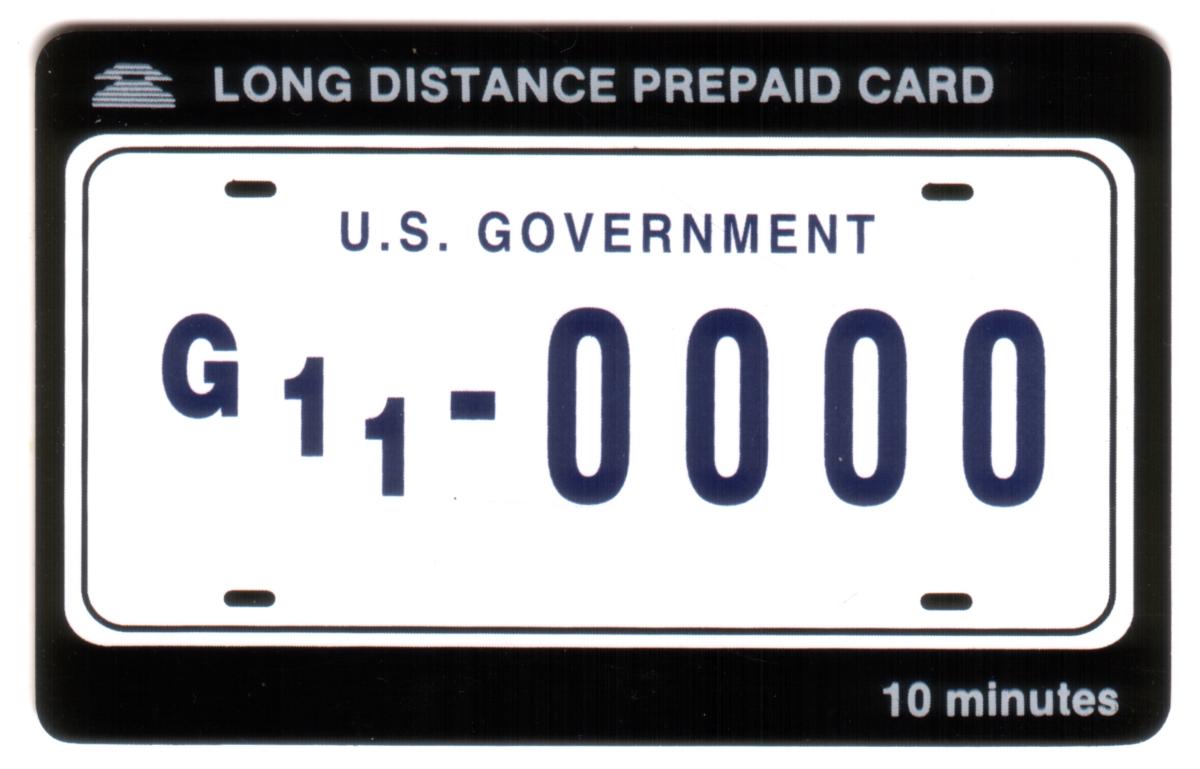 This collectible phone card features an image of a U.S. Government license plate prominently centered on a black background. The license plate is primarily white with dark blue alphanumeric characters reading "G 11 - 0000". Above the plate, the text "U.S. GOVERNMENT" is printed in all capital letters, also in dark blue. The top section of the card displays the words "LONG DISTANCE PREPAID CARD" in white text on a black strip, indicating the card's function for prepaid long-distance telephone use.