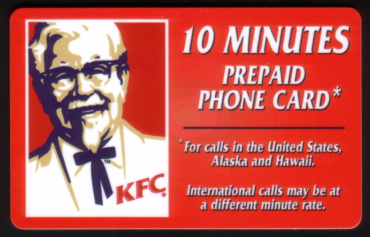 In the lower left corner, the card denomination "10m" is clearly shown, indicating its value. The text “TeleDebit” appears near the denomination, specifying the type of card. The overall layout includes bold red and white elements with the "Kentucky Fried Chicken" name printed prominently, reinforcing the Americana fast food theme. The card is part of a promotion related to restaurant chains and trademarks.