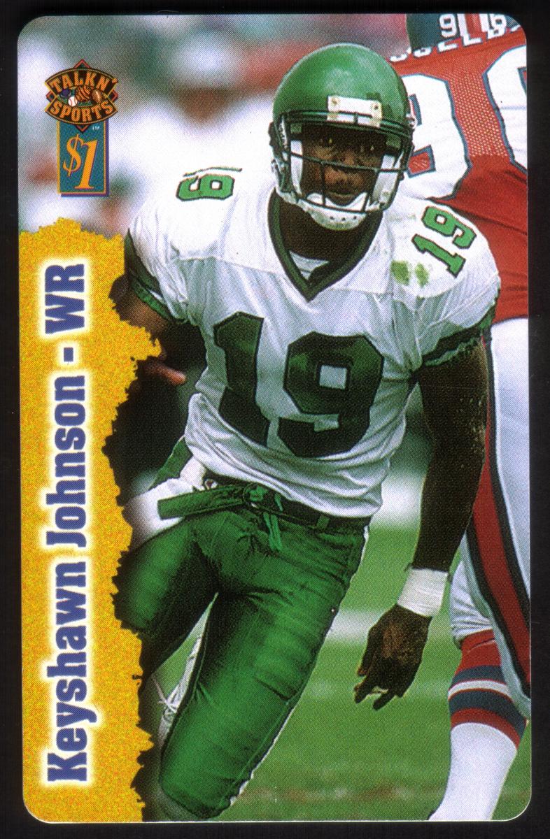 Keyshawn Johnson is pictured wearing a football uniform, prominently showcasing his position as a wide receiver. The imagery and design emphasize the NFL and football themes, with the title "Talk N' Sports" and a clear reference to the sport within the card’s layout. The overall style of the card reflects communication about sports, highlighting Johnson’s role and presence in professional football.