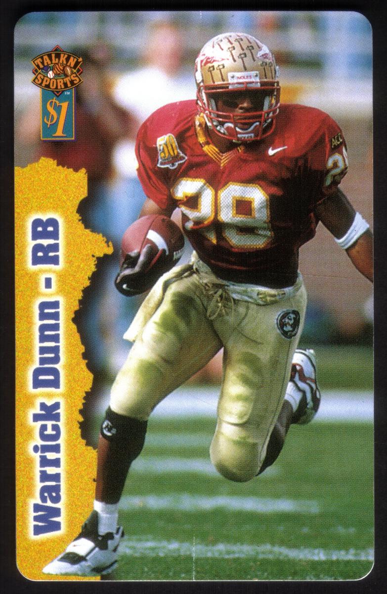 The card’s design includes the official NFL logo, emphasizing its connection to the National Football League, and it prominently displays the denomination of $1. The background is styled with sports-themed graphics that complement the image of Warrick Dunn, reinforcing the football and NFL branding. The card’s front also features the title “Talk N’ Sports” and “The Score Board (FRO)” text, indicating the series and issuer.