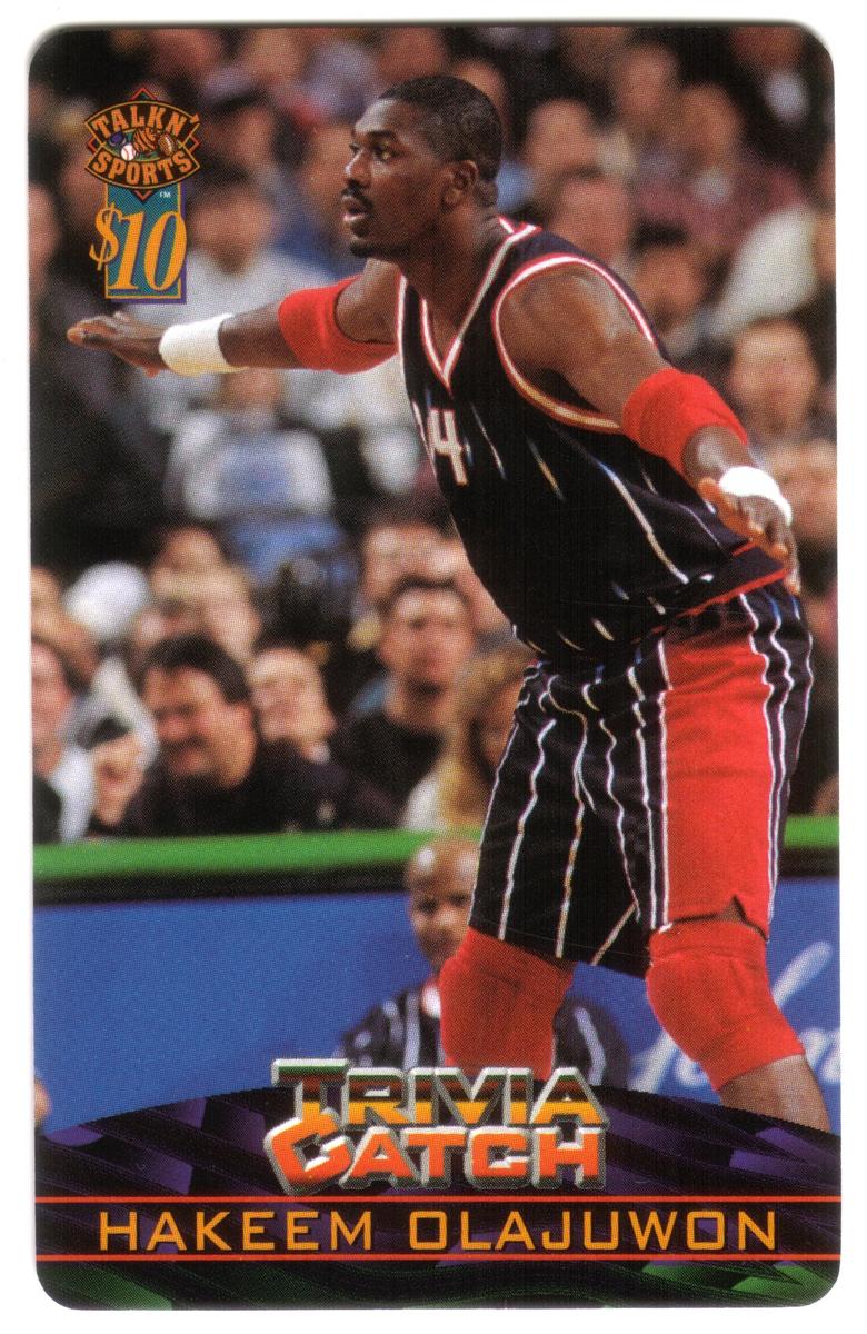 This collectible chip card features Hakeem Olajuwon, a celebrated basketball player recognized as one of the NBA’s greatest centers. The card is identified as the second card in a series of ten and is part of the "Talk N' Sports" $10 collection. The design prominently displays Hakeem Olajuwon’s name alongside the National Basketball Association (NBA) logo and basketball imagery, reinforcing the card’s strong association with professional basketball and MVP players.