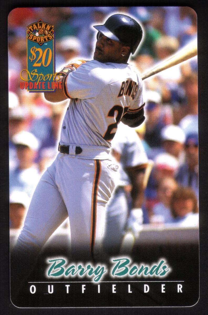 The background includes an orange and yellow gradient with a faint image of a baseball stadium or field. The card is branded with "Talk N' Sports" and carries a $20 denomination. It is part of the MLB (Major League Baseball) collection and highlights Barry Bonds as an outfielder. The "The Score Board (FRO)" logo is also visible on the card, indicating the issuing entity.