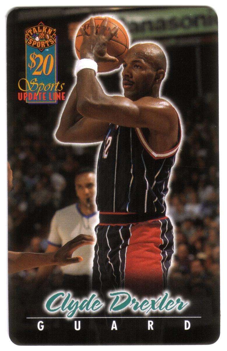 The background and layout focus primarily on basketball-related elements, including basketballs and the NBA logo, reinforcing the card’s sport-centric nature. This item serves as a collectible item for basketball fans and collectors interested in NBA memorabilia, specifically highlighting Clyde Drexler’s athletic career.