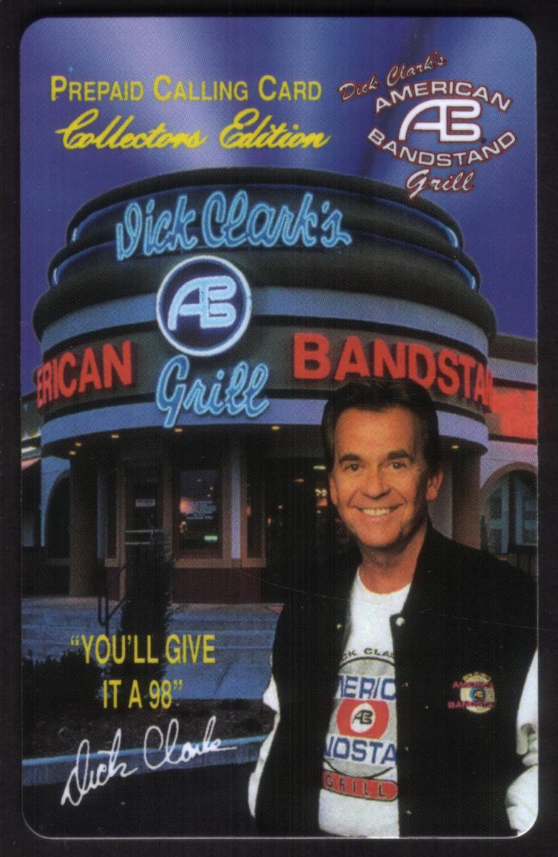 This collectible prepaid calling card features Dick Clark standing in front of Dick Clark’s American Bandstand Grill. The restaurant’s marquee is prominently displayed in neon lights, with “Dick Clark’s” in blue cursive above the circular “AB Grill” logo, and “American Bandstand” in red block letters wrapping around the building’s curved facade. The background shows the grill’s entrance with symmetrical columns and large glass doors under the illuminated sign.