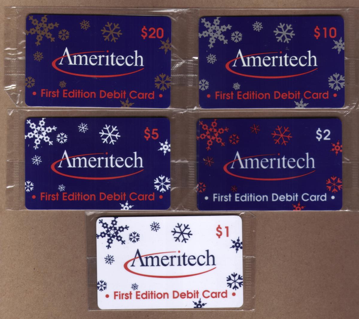 This is a matched set of five Ameritech First Edition Debit Cards featuring dollar values of $1, $2, $5, $10, and $20. Each card prominently displays the Ameritech logo, which consists of the word “Ameritech” in white with a red swoosh beneath it. The cards include the text “First Edition Debit Card” printed clearly at the bottom in red or white, depending on the card’s background color.