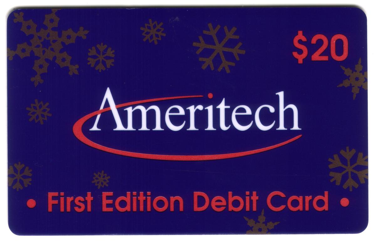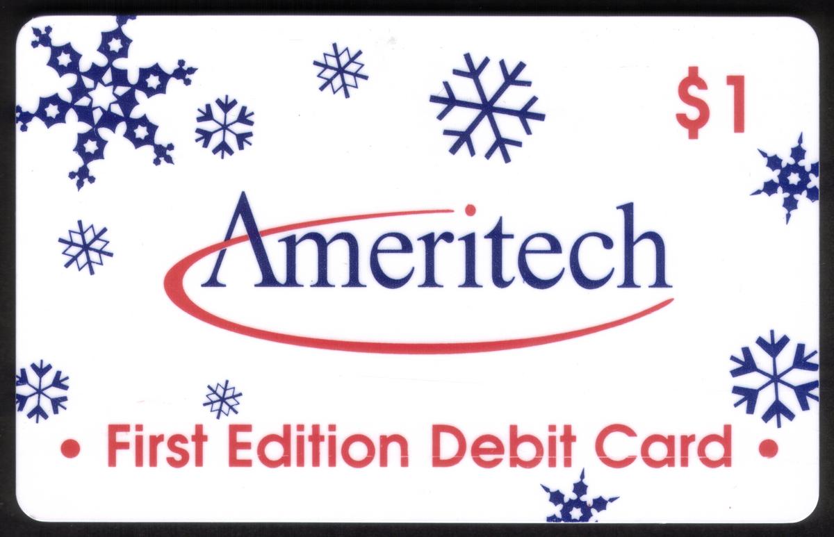 Each card’s design uses a winter theme with snowflakes as the main decorative motif. The consistent placement of the Ameritech logo and "First Edition Debit Card" text across all five cards, combined with their increasing dollar values, creates a cohesive collectible set. This set is categorized as debit cards issued by Ameritech.