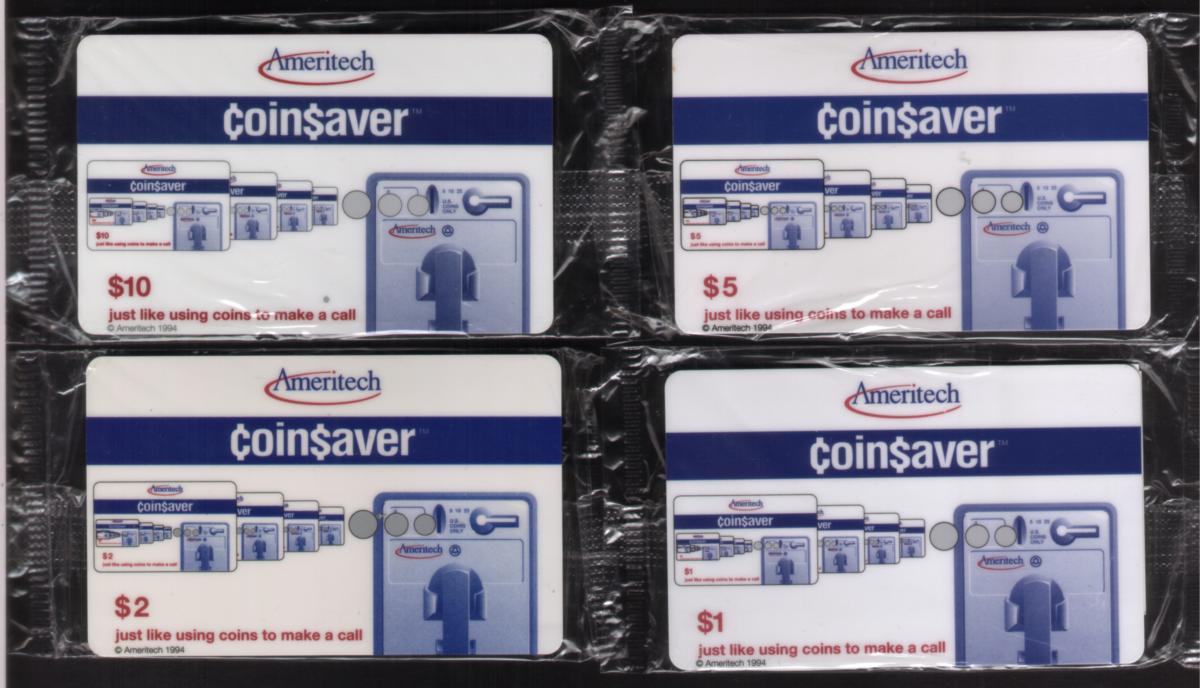 Set of four Ameritech coin$aver phone cards from 1994 featuring payphone coin mechanisms, recursive design, and branding promoting coin-based calling. |