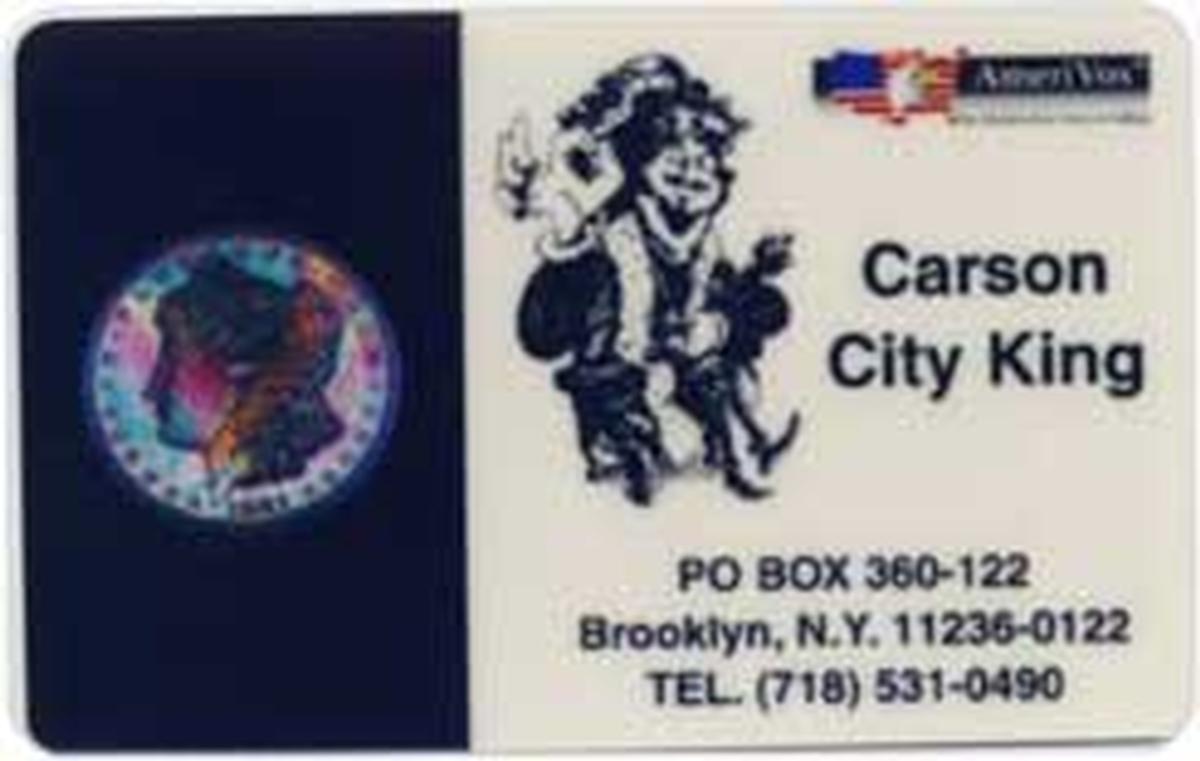 The card bears the AmeriVox logo in the upper right corner, reinforcing its official release status. The design includes a dark background that highlights the bright silver of the coin, which enhances its visual importance. Along the top portion, the card has bold, uppercase text that reads "CARSON CITY KING" with supporting smaller print that connects the item to "silver coins" and "coin collecting," making it clear this is part of a collectibles series focused on historical currency.