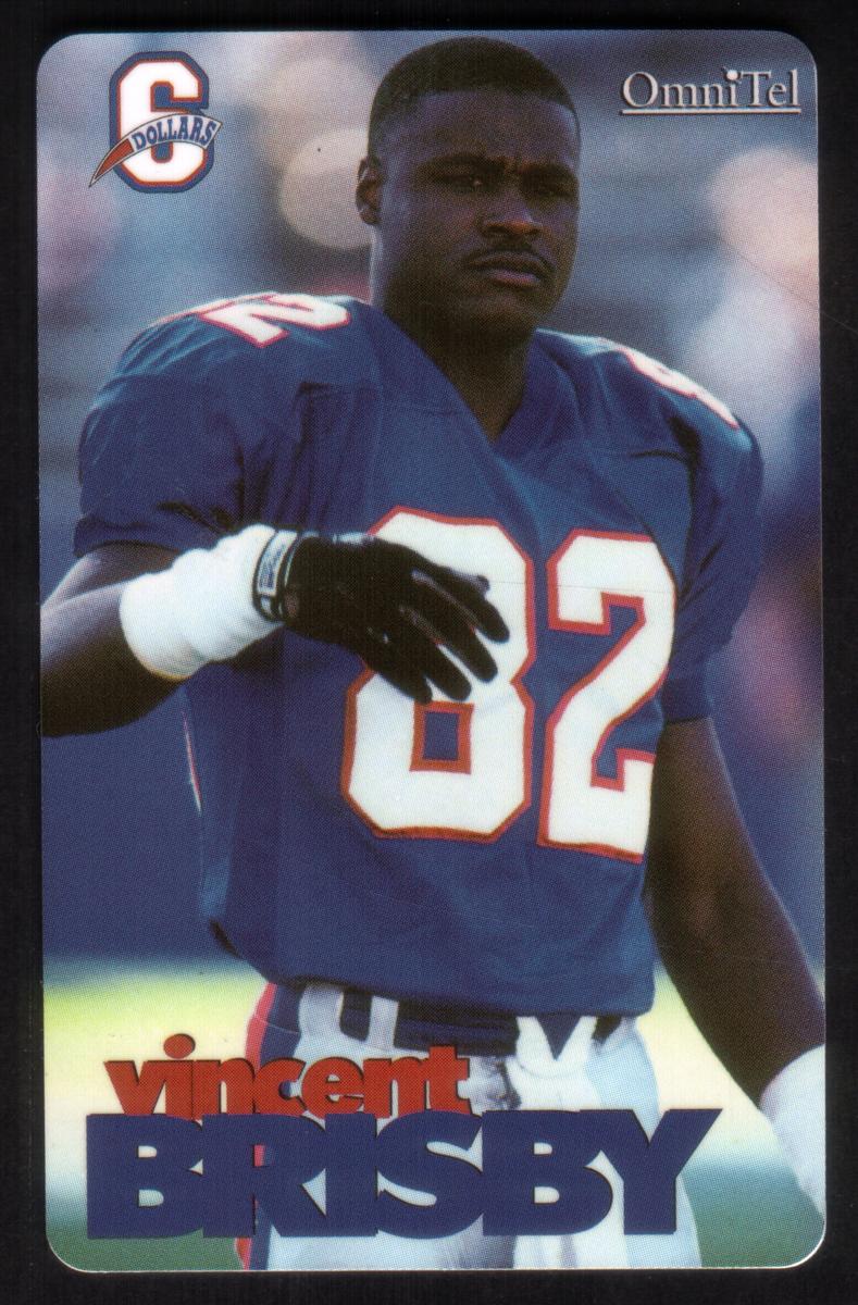 The card design includes the NFL logo and the words "Football Players" as part of its theme, along with the name "Vincent Brisby" clearly printed on the front. The issuing company OmniTel is also marked on the card, indicating the card’s origin and authenticity as a collectible item linked to telecommunications. The overall layout is clean and focuses on the athlete, with a plain or muted background that keeps attention on Vincent Brisby.