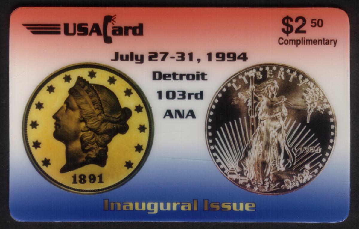 This collectible telecard commemorates the 1994 American Numismatic Association (ANA) Convention held in Detroit, Michigan, the event’s 103rd iteration. The card prominently features images related to numismatics, including $20 gold coins—specifically the Gold Liberty and the Walking Liberty designs. The design incorporates themes of money and currency, highlighting their significance to collectors and attendees of the ANA Convention. The card is marked as a complimentary inaugural issue giveaway, emphasizing its status as a special collector’s item distributed during the event.