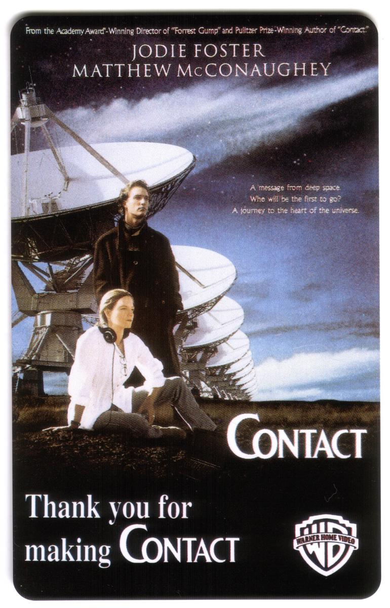 The card’s layout includes the title “Contact Movie,” emphasizing its connection to the well-known science fiction film directed by Robert Zemeckis. The depiction uses a color scheme that complements the movie’s atmosphere, incorporating shades that evoke the film’s dramatic and mysterious tone. The text and logos are arranged to highlight Warner Bros. Home Video as the publisher and distributor of this collectible item.