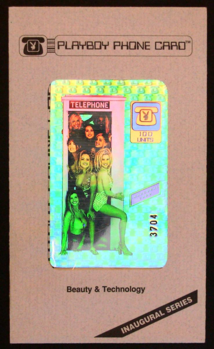 The front of the card includes stamped serial numbering, which is visible and printed clearly on the card to certify its unique identification. The overall design integrates images of telephone-related equipment, such as telephones or phone booths, referencing the purpose and setting of the card for telephone use. The Playboy Playmates featured symbolize the modeling and entertainment aspects, which align with the card’s promotional nature.