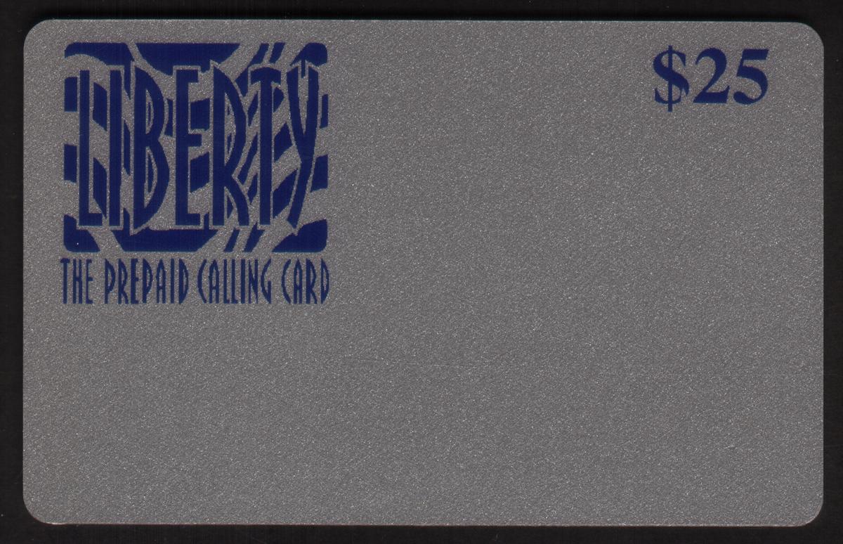 The card incorporates logos and trademarks, confirming its official status and making it a collectible phone card. The silver background provides a metallic, reflective effect that contrasts with the blue elements, enhancing visibility and aesthetic appeal. This collectible phone card is intended for prepaid calling services, specifically under the Liberty brand provided by Quest Group International.