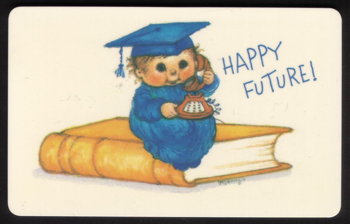 The third card shows a small anthropomorphic stuffed bear-like character wearing a blue graduation cap and gown, seated on a large yellow book. The character holds an old-fashioned rotary telephone receiver up to its ear. Next to the figure, the words "HAPPY FUTURE!" appear in cheerful blue hand-drawn letters.