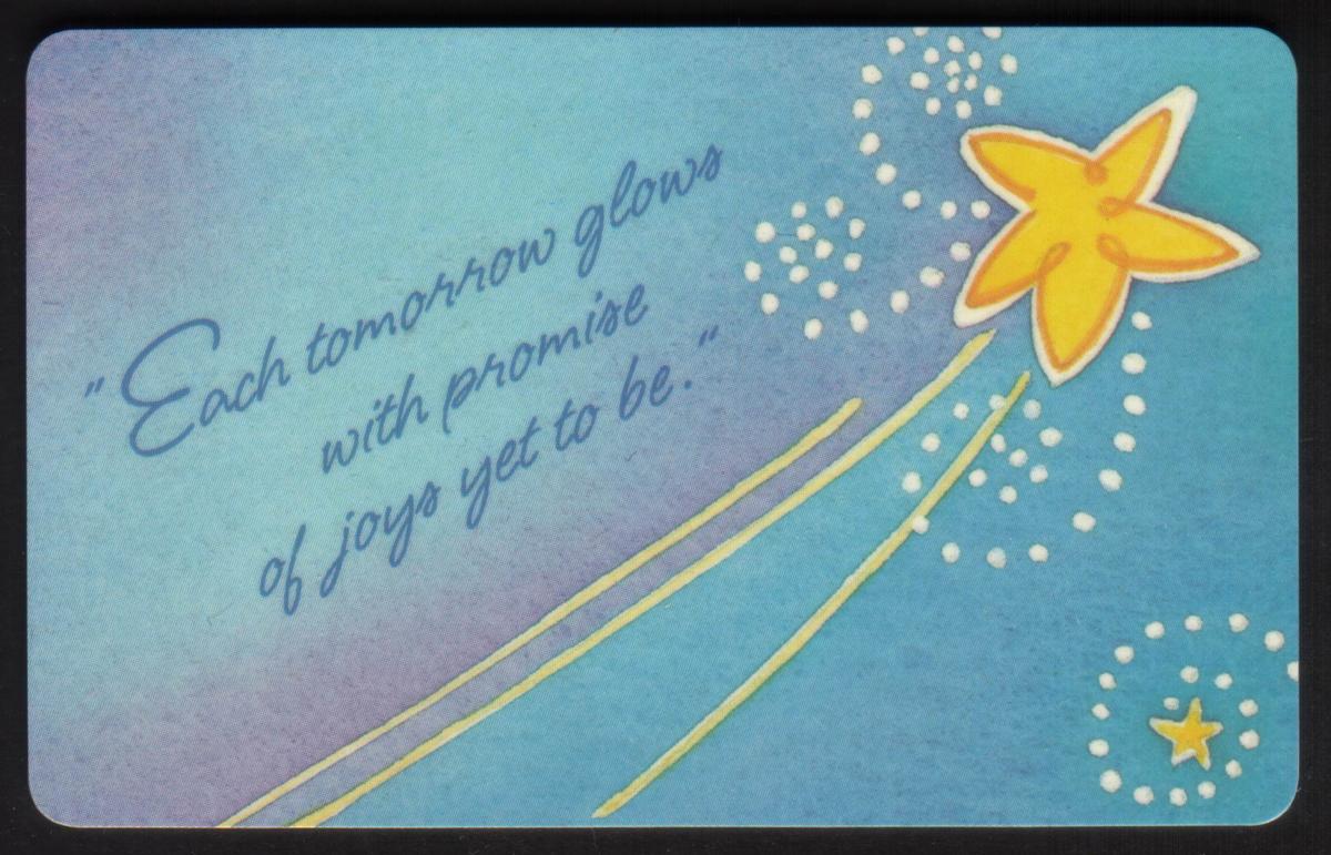 The fourth card uses soft purple and blue gradients as a background. A large golden shooting star with a sparkling trail arcs from right to left. The text reads: "Each tomorrow glows with promise of joys yet to be." The design includes additional small stars, enhancing the theme of hope and aspiration.