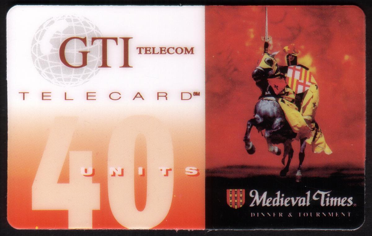 The card includes text indicating "Medieval Times" prominently, reinforcing the connection to the well-known dinner theatre experience. The words "Dinner Theatre" are also visible, emphasizing the unique combination of live jousting entertainment and dining. Additionally, the chip card bears the logo of GTI Telecom, Inc., the company associated with its production or distribution.