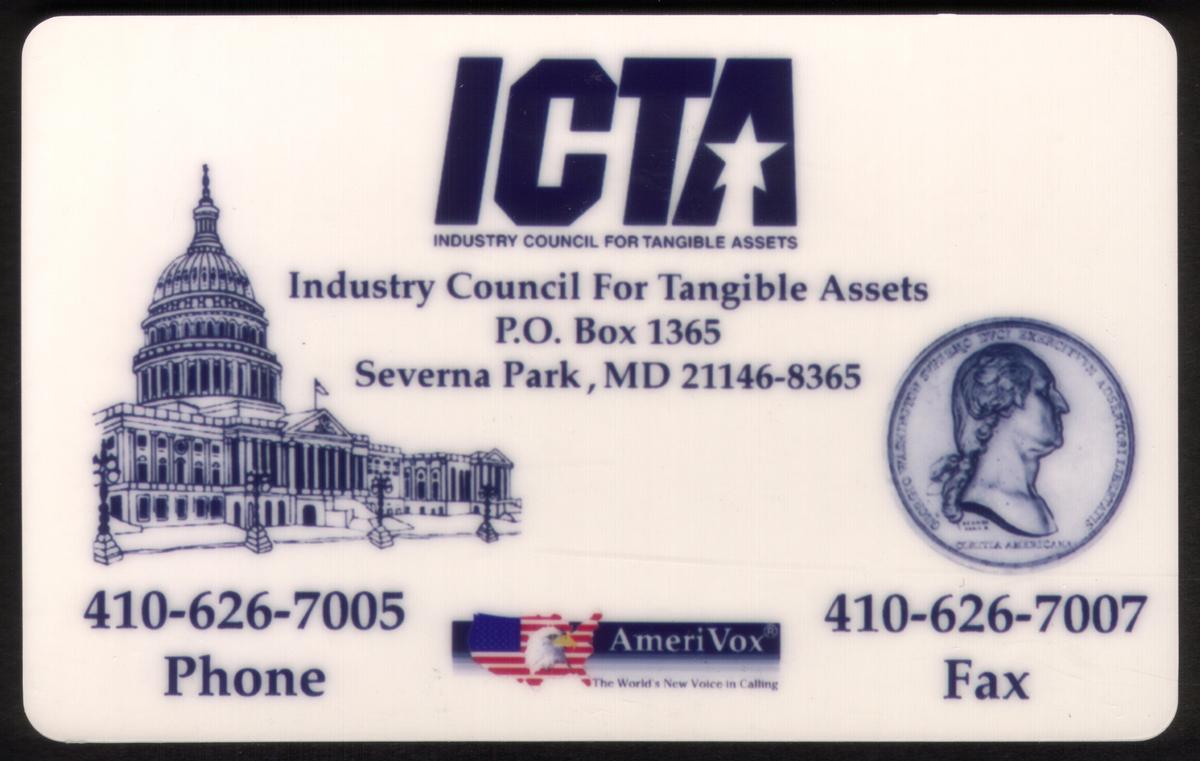 This card relates to collectibles and numismatics, specifically within the theme of currency, money, and coin collecting. Severna Park, Maryland, is referenced in the keywords, connecting the card’s production or distribution to that location. The use of Amerivox and ICTA indicates its association with authorized tangible asset collectibles recognized by relevant collector organizations.