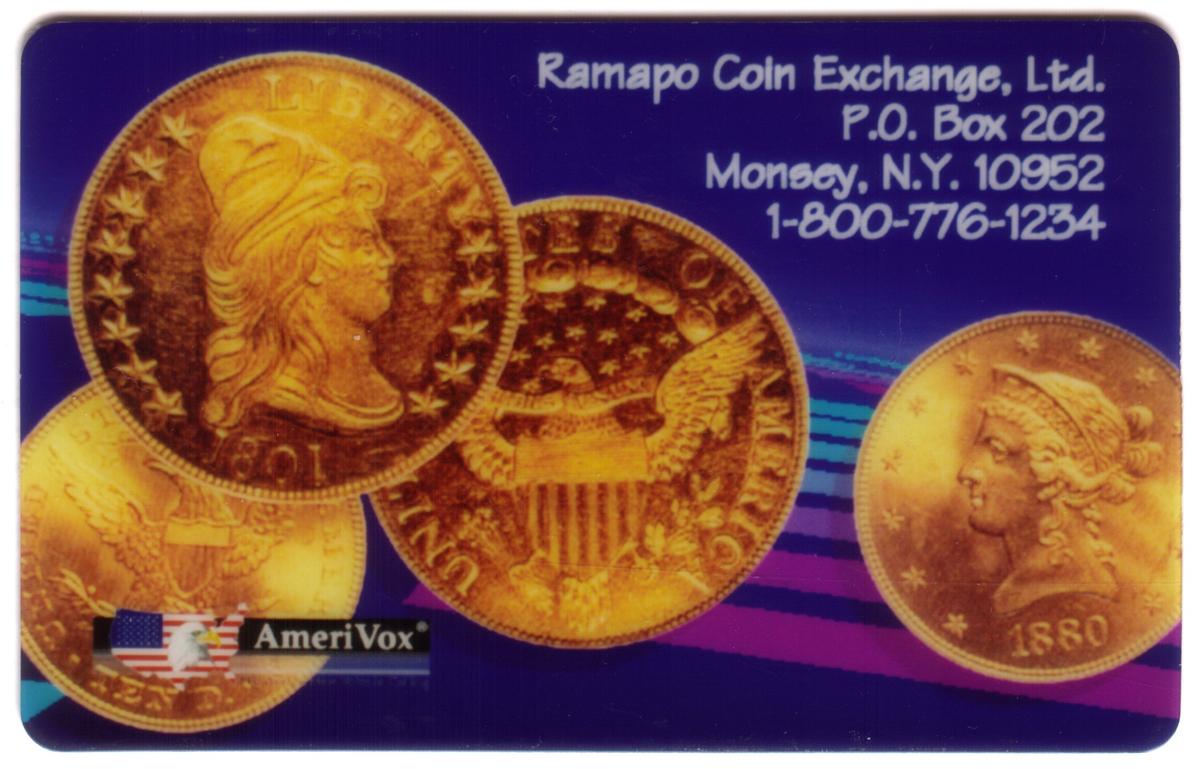 Ramapo Coin Exchange $10 phone card featuring American gold coins, vibrant colors, detailed coin images, and promotional branding, ideal for collectors and enthusiasts. |