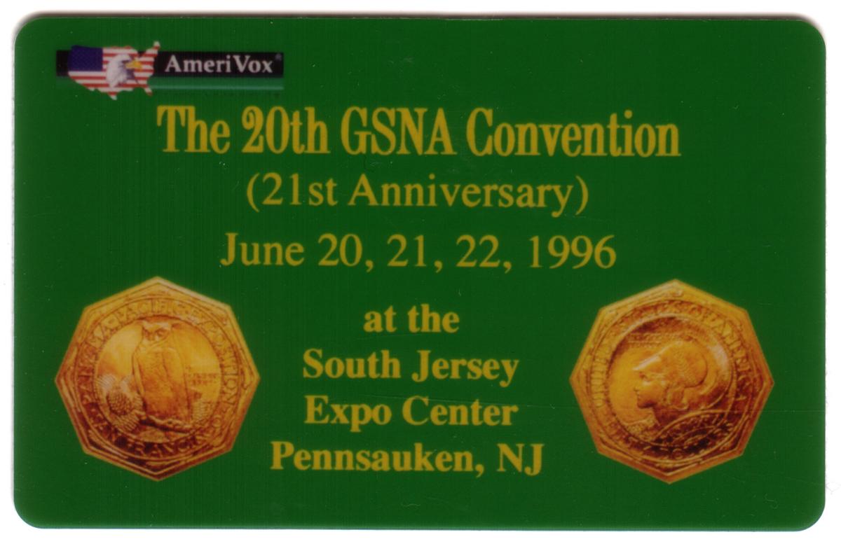 This collectible card commemorates the 21st Anniversary of the GSNA (Gold Stamp Numismatic Association) Convention held in New Jersey. It features the South Jersey Expo Center located in Pennsauken, New Jersey, as a central element of its design. The card highlights the June 1996 convention, marking an important event in the numismatic community.