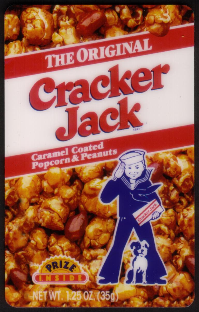 This collectible card features the packaging design of The Original Cracker Jack, a caramel coated popcorn and peanuts snack. The card prominently displays the Cracker Jack logo in large red letters across a white diagonal banner, set against a background filled with caramel-coated popcorn and peanuts. Below the logo, the description reads "Caramel Coated Popcorn & Peanuts" in white text on a red strip.