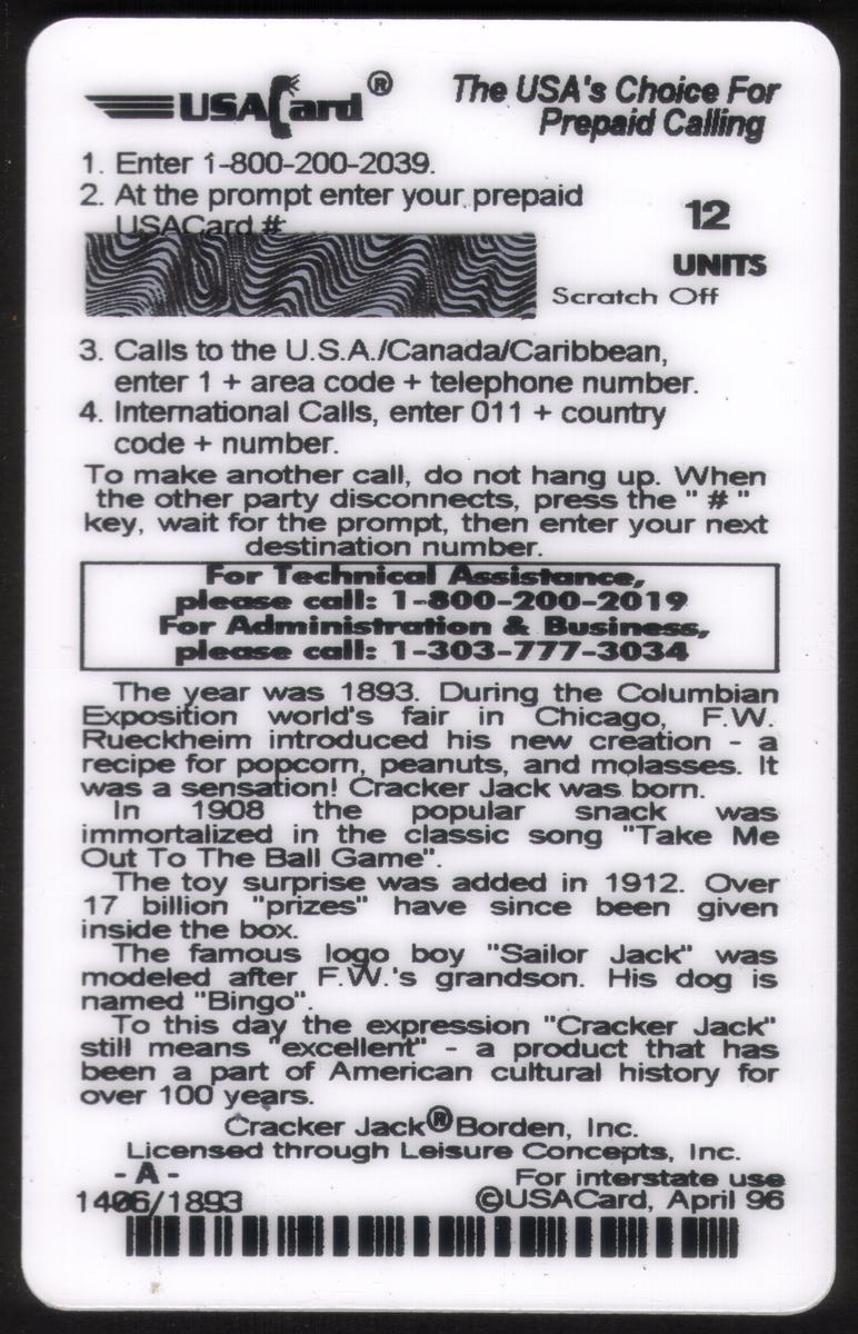 This card is linked to the USACard Corporation and falls under the promotional theme of Americana, snacks, and foods relating to Cracker Jack. It combines traditional branding elements such as the vintage sailor and dog mascots with the classic sweet treat imagery of popcorn and peanuts coated in caramel.