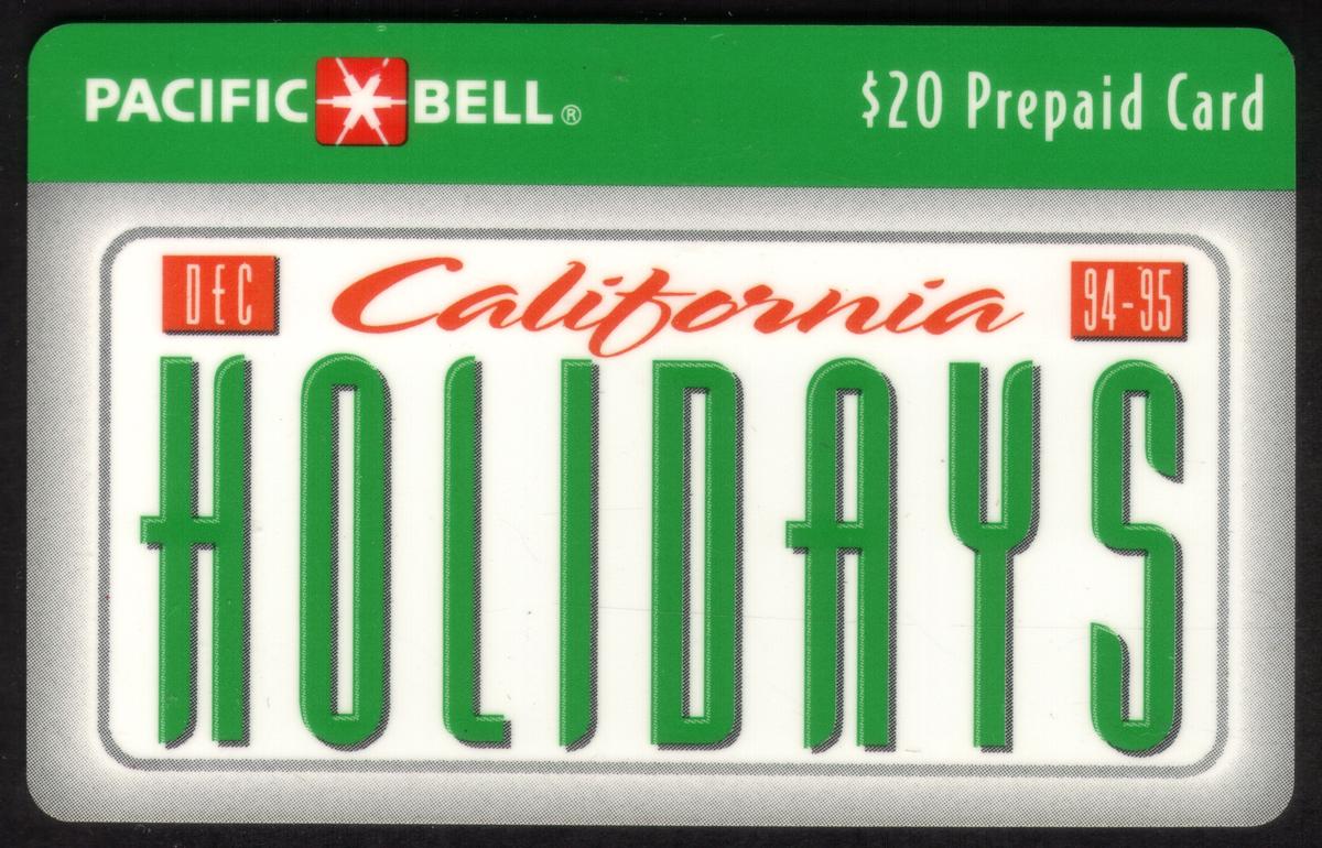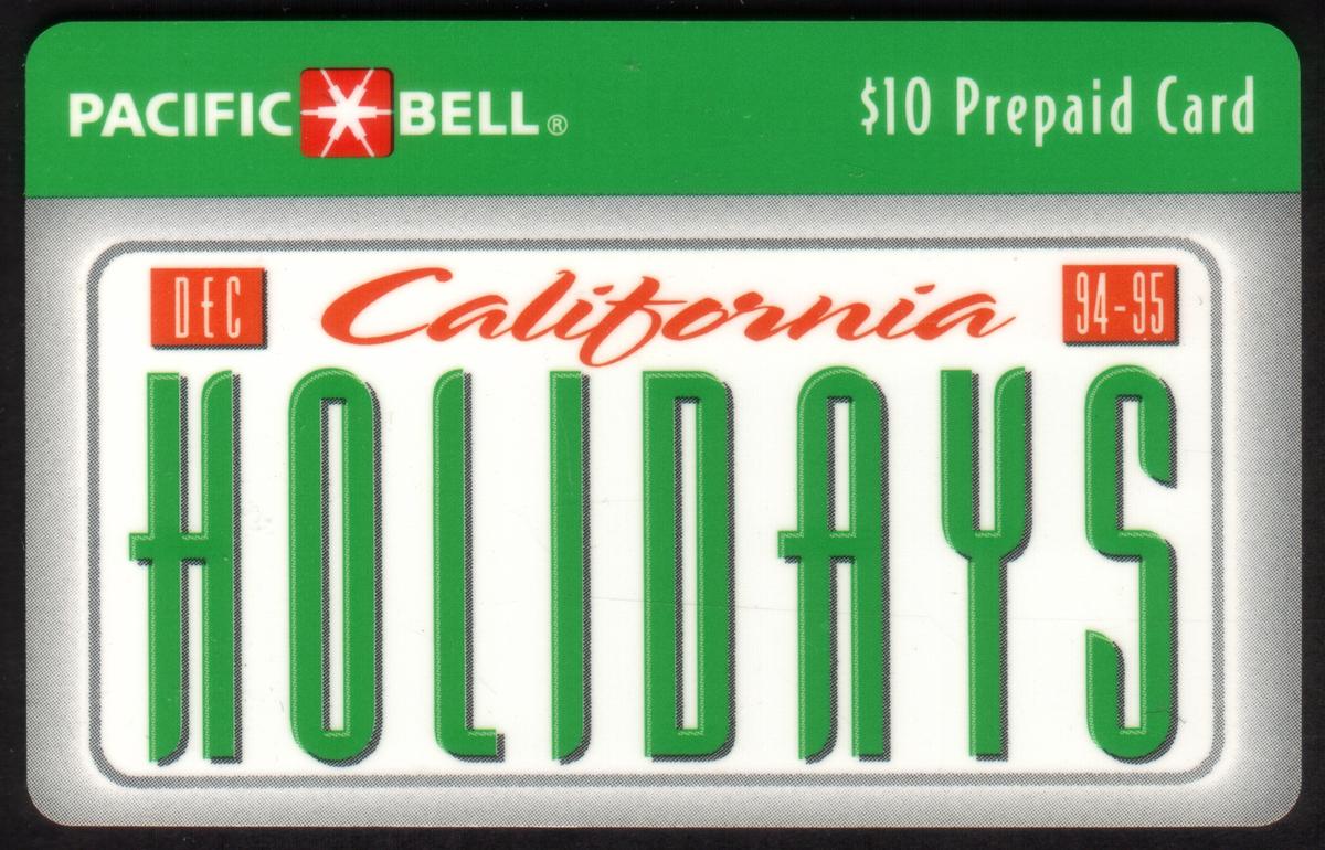 The overall layout evokes a license plate style, linking it to the theme of California Christmas decorations. The card’s colors—red, green, white, and orange—reflect traditional holiday tones. This prepaid card is part of the California Holidays License series, issued by Pacific Bell for use during the Christmas season, representing a collectible phone card marking the festive period of 1994-1995.