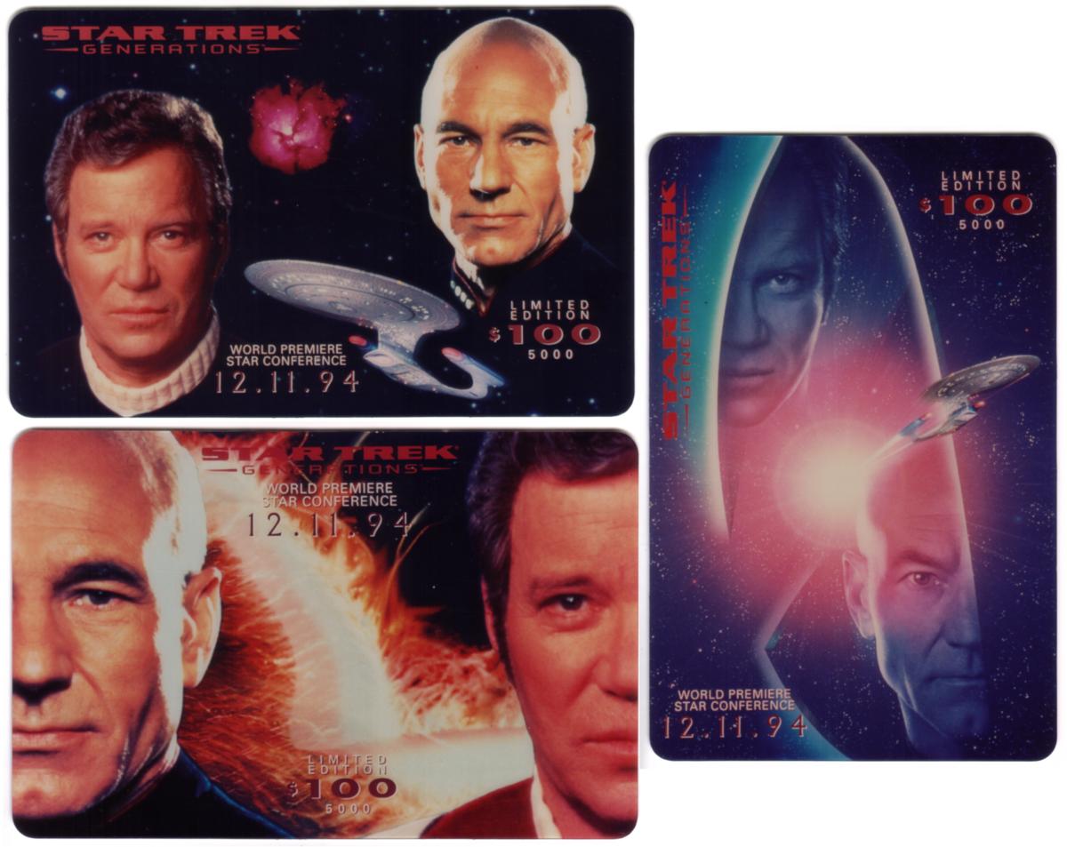 These three collectible Star Trek Generations cards each have a $100 denomination and are part of a limited edition of 5,000 copies. Each card commemorates the world premiere Star Conference held on December 11, 1994. All three cards include the text “STAR TREK GENERATIONS” and the premiere date along with the limited edition and denomination details.