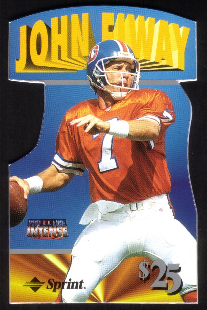 The card's design integrates the NFL and Proline Intense logos, reinforcing its official association with the league and the 1997 collection. The overall presentation highlights John Elway’s status as a key player during that era, with a focus on the die-cut shape that sets this card apart from standard rectangular formats.