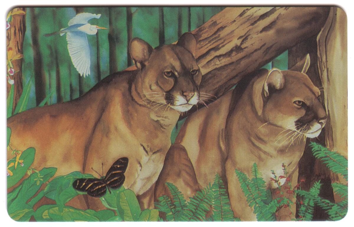 A third card illustrates two mountain lions resting amidst a forested setting. The two mountain lions are positioned near a large fallen tree trunk surrounded by ferns and tropical greenery. One lion faces forward with an alert expression while the other looks to the right. A large black butterfly rests on vegetation in the foreground, and a white heron is flying in the background. This scene captures a serene moment in wild animal life with careful attention to realistic details and natural colors.
