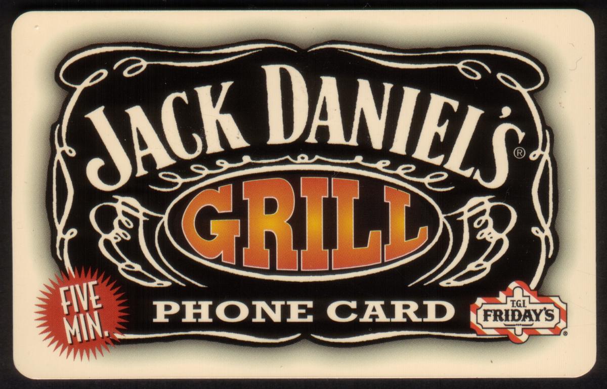 This collectible phone card displays a prominent black and white Jack Daniel's logo with the word "GRILL" in large, bold orange and yellow gradient letters at the center. Above the word "GRILL," the text "Jack Daniel's" is styled with curved, elegant lettering commonly associated with the brand. Below "GRILL," the words "PHONE CARD" appear in white capital letters on a black background band, emphasizing the card’s function.