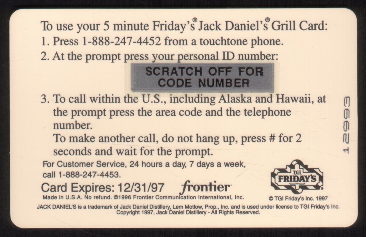 In the bottom left corner, a red starburst graphic reads "FIVE MIN." indicating the card’s five-minute usage value. In the bottom right corner, there is a small logo featuring "TGI FRIDAY'S" in a white and red outlined box, highlighting the partnership or promotional connection with the Jack Daniels Grill Restaurant found in TGI Friday's locations.